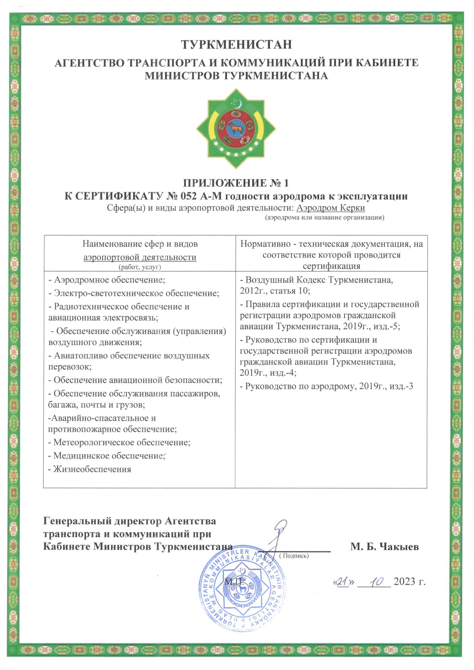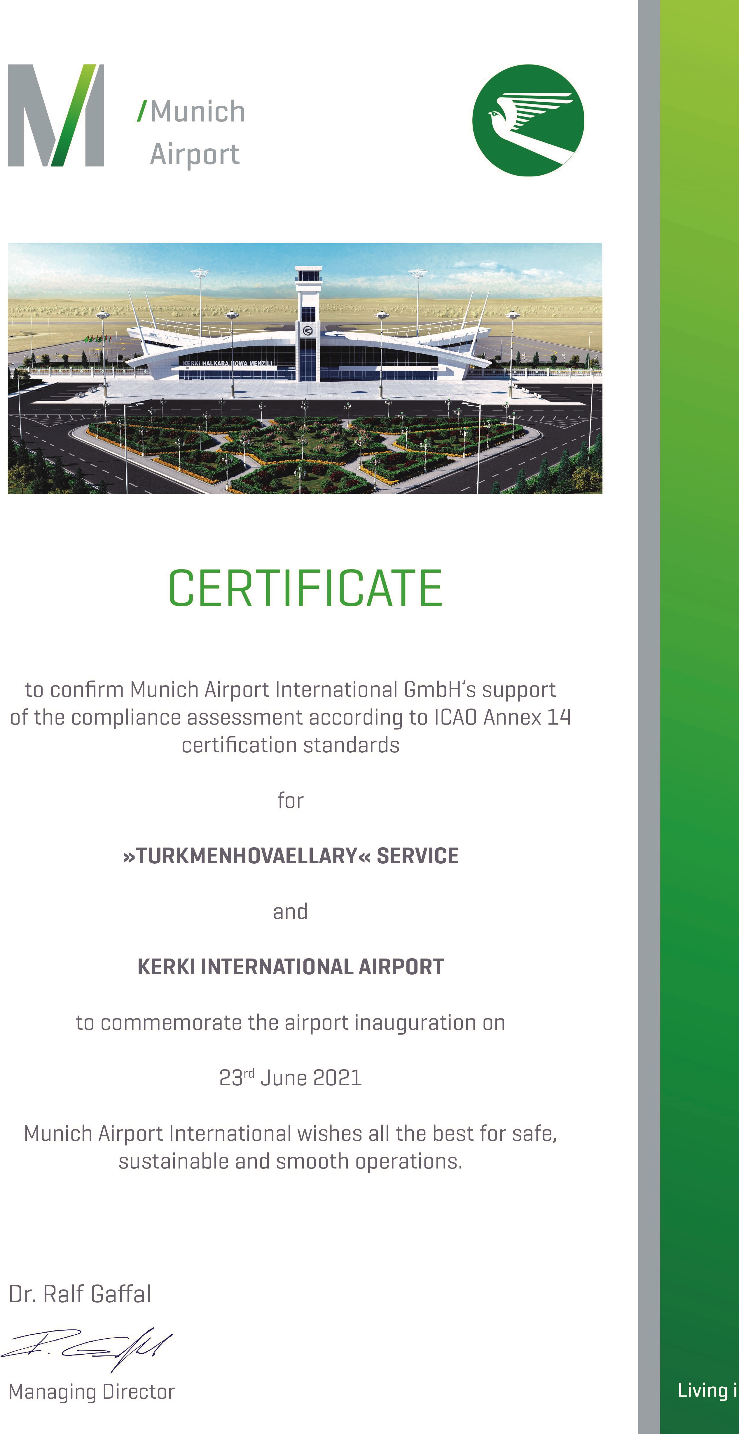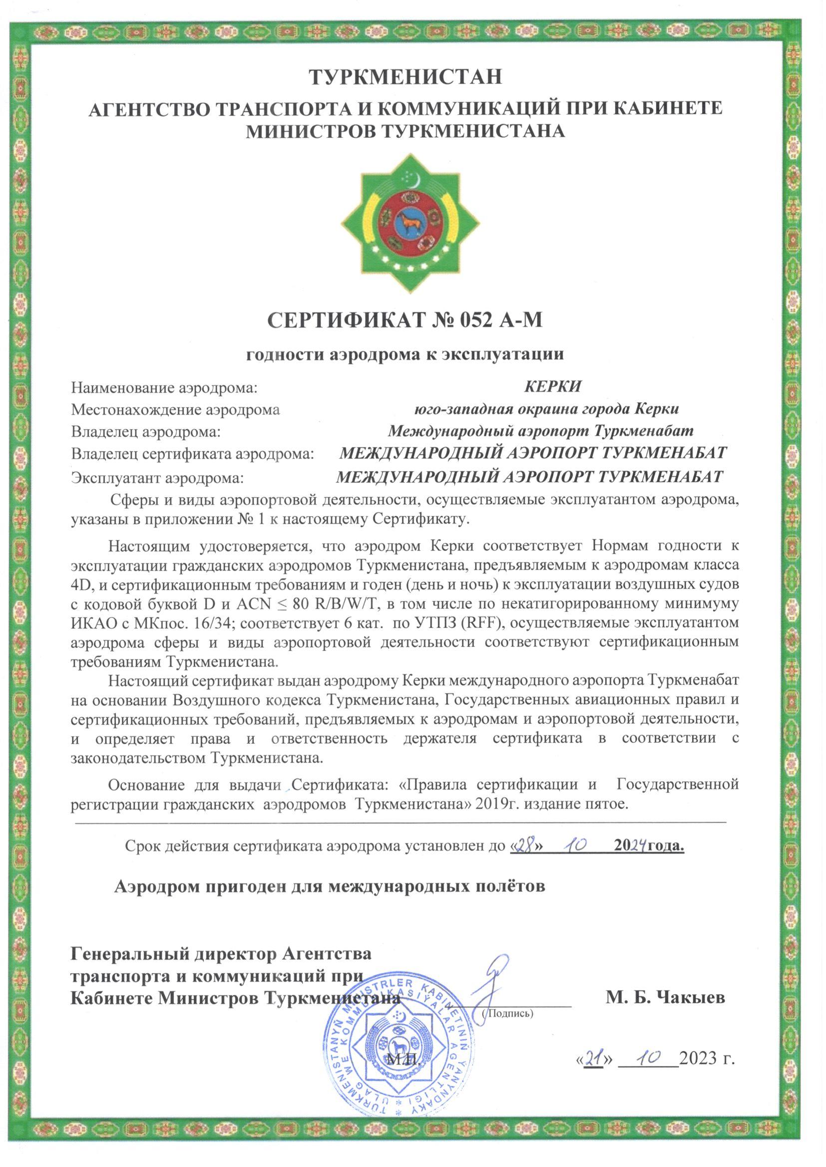Kerki halkara howa menzili Türkmenabat-Kerki awtoulag ýolunyň we şäher demir ýol menziliniň golaýynda ýerleşýär. Kerki howa menziliniň geçirijiligi sagatda 100 ýolagça niýetlenen bolup 2021-nji ýylyň iýun aýynda işe başlady. Täze howa menzili, 2012-2030-njy ýyllar üçin Türkmenistanyň raýat awiasiýasyny ösdürmek boýunça milli maksatnamanyň durmuşa geçirilmeginiň çäginde gurlan dördünji infrastruktura desgasyna öwrüldi, oňa laýyklykda täze terminallar gurulýar we bar bolan profil desgalaryň we gulluklaryň durky täzelenýär. Terminalyň umumy meýdany 2221 m² metre deňdir. Binada ýolagçy hyzmatlary üçin ýük we el goşlary tabşyrylýan ýer, ilkinji gözden geçiriliş ýeri, petek kassalary, maglumat nokady, garbanyşhana, sowgatlyk önümler we gazet-žurnallar satylýan nokatlar, dermanhana, lukmançylyk otagy, gidýän ýolagçylaryň we ugradýan adamlaryň garaşýan ýeri ýerleşdirilipdir. Gidiş zaly kafeteriý, ene we çaga otagy we namaz okalýan otagy bolan 120 orun üçin niýetlenendir. Ýolagçylar üçin goşlary almagyň zaly göz öňünde tutuldy. Şeýle hem CIP toparlary we ýolagçylar üçin hyzmat zolagy bar, ol üpjün etmekde dolulygyna özbaşdakdyr. Terminalyň goýberiş ukyplylygy sagatda 100 ýolagçydyr. Terminalyň binasy iki gatly bolup, onuň içinde beýikligi 31,7 metr bolan dolandyryş diňi ýerleşýär. Howa menzilinde uzynlygy 2700 metr we ini 60 metr bolan uçuş-gonuş zolagy ulanylýar. "D" kody bilen perron iri göwrümli uçarlary kabul edip biler. Dikuçarlar üçin 4 sany duralga bar. Uçuş ýolunyň uzynlygy 202 metr, ini 44 metr. Kerki halkara howa menzilinde gözleg-heläkçilikde halas ediş merkezi döredildi we ol adatdan daşary ýagdaýlarda çalt hereket etmegi üpjün edýär. Ýangyndan goramagyň 7-nji derejesi üpjün edilendir. Howa gämileriniň uçuş-gonuşyna gözegçilik etmek üçin beýikligi 15,24 metr bolan diň ýerleşdirildi. • KAMAZ-12/60-63501 — suw çelegi 11300 l, köpürjik 700 l, ýangyç 220 l, 6 adamlyk topar bilen. • MAN-FLF-80-114-14+250P — suw çelegi 11400 l, köpürjik 1400 l, tozly ot söndüriji 250 kg, ýangyç 300 l, 2 adamlyk topar bilen. • KAMAZ ASA-20 — 6×6 halas ediji awtoulag, 2 bakda 220 l ýangyç, kran, generator we gurallar bilen. Lebap welaýatynyň Kerki şäherindäki täze halkara howa menzili daşary ýurt awiakompaniýalaryna ýokary hilli ýerüsti hyzmatlary hödürleýär hem-de iň amatly bahalary üpjün edýär.